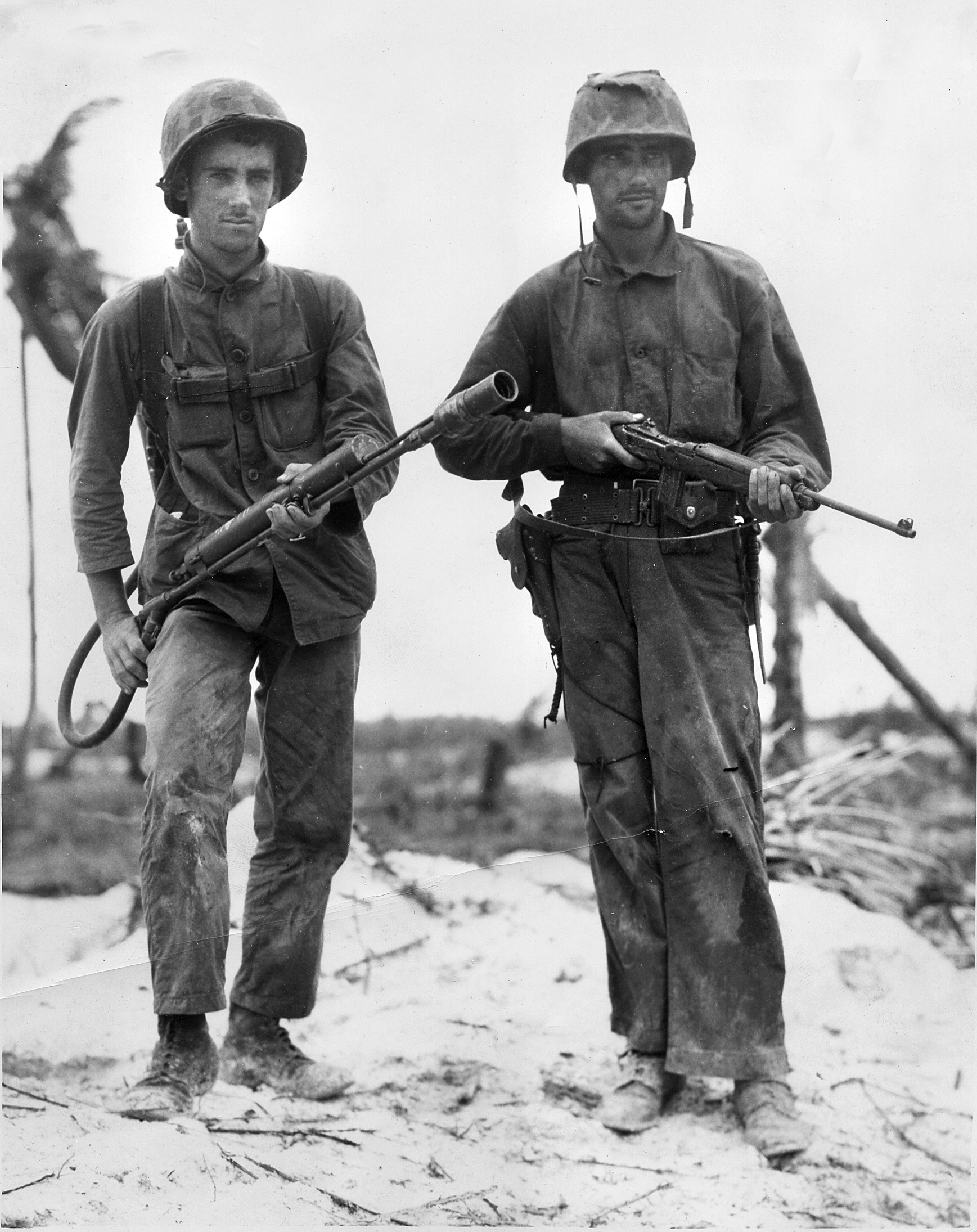 Marine Pfc. Stanley A. Parks, then of Allentown, holds a flamethrower on Peleliu. Randolph Peters carries a .30-caliber carbine.