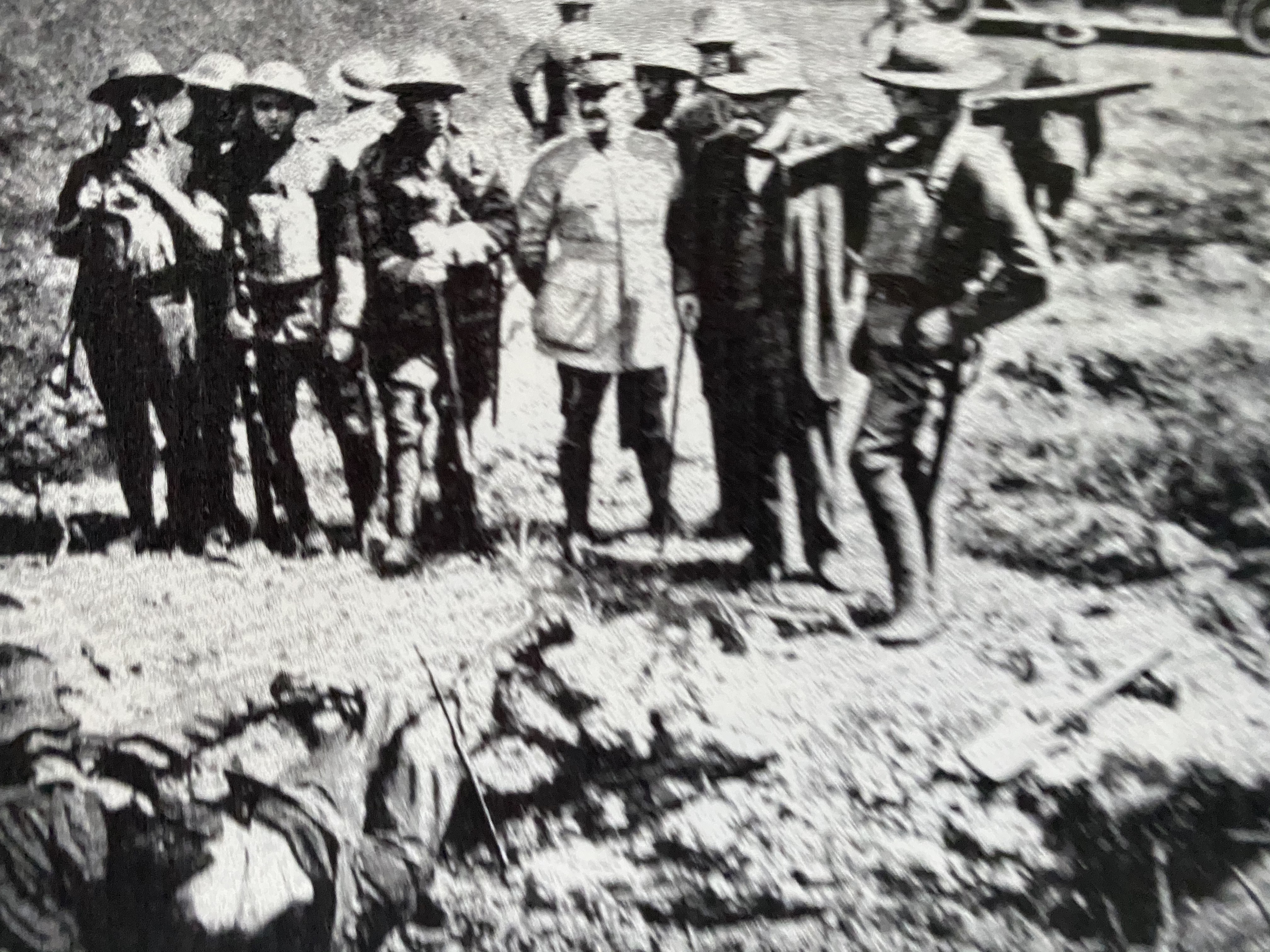 This photo appeared in Volume 1 of the Michelin Illustrated Guides to the Battlefields (1914-1918). The book title is “The Americans in the Great War: The Second Battle of the Marne.” The caption reads: “The French prime minister, M. Clemenceau, congratulating the American troops on the battlefield at Chateau-Thierry.” Clemenceau is second from the right. The photo is credited to the French illustrated weekly newspaper, L’Illustration, published in Paris.