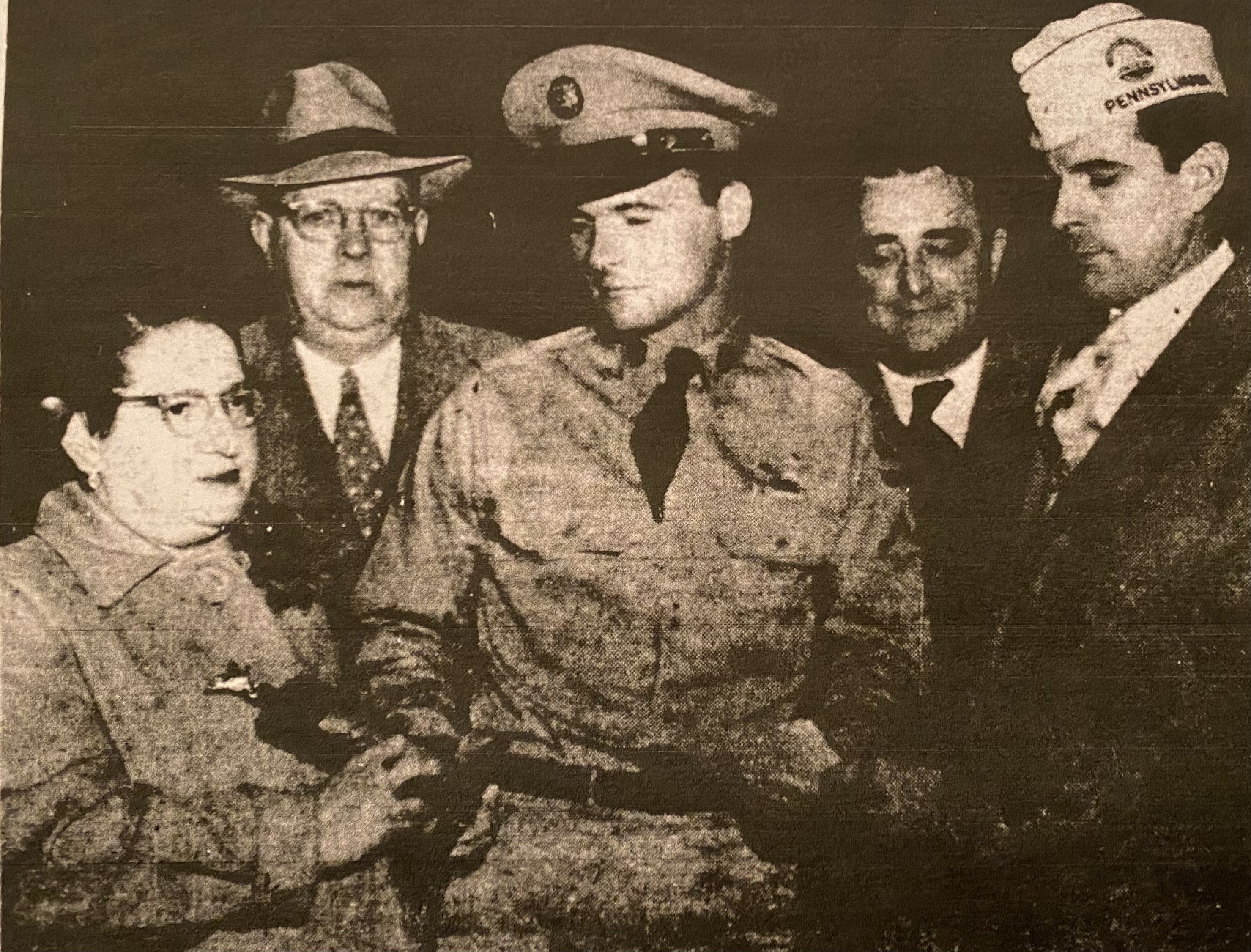Ex-POW Gene Salay, an Army infantryman, during halftime at the Bethlehem-Hershey football game October 9, 1953, at Liberty High School, which Gene had attended. With him are (from left) Mr. and Mrs. John Griffith of the Bethlehem Merrymakers, who gave him a plaque; Mayor Earl E. Schaffer; and Edward McCarroll, commander of AmVets Post 4, who gave Gene a life membership in the organization. It was “Gene Salay Day” in his hometown. He was on a thirty-day furlough and would return to Valley Forge General Hospital to continue his rehabilitation.