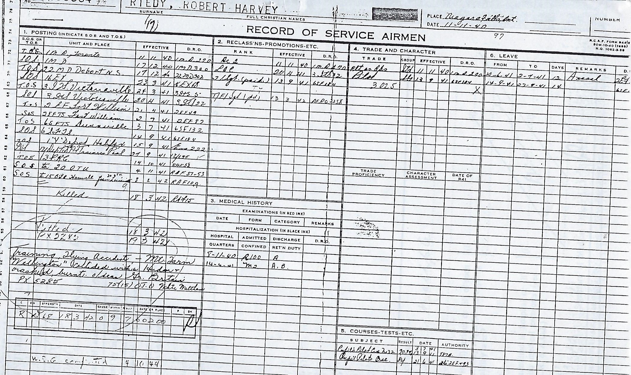 According to his RCAF service record, he was assigned to No. 20 Operational Training Unit at Lossiemouth, Scotland, which trained night bomber crews using the twin-engine Vickers Wellington. An OTU was the crews’ final training stage and included operational sorties.