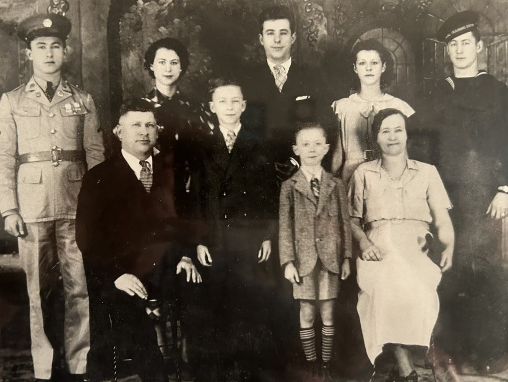One is a family portrait Matt believes was taken in 1936, when he was 11. The other is a candid shot showing him and six other LST-553 crew members standing on a Japanese boat on Leyte Island in the Philippines. It was 1945, the war was over, and they were assigned to disarm Japanese troops – a job that brought Matt a prized possession, an officer’s sword.