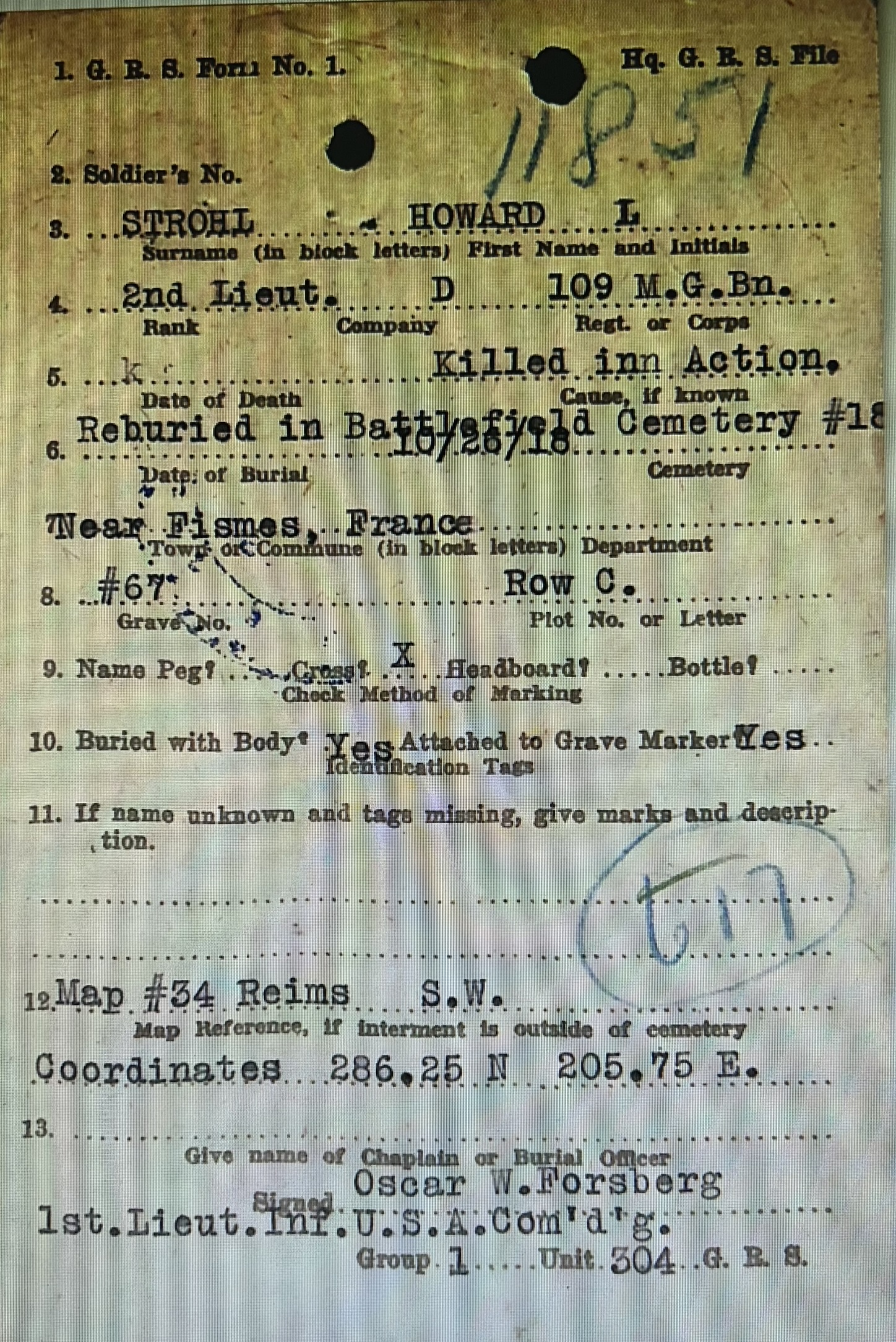 Just before the Lieut. was hit I was with him in the cellar of a house which was on the street leading from the city hall to the Vesle River. Lieut. Strohl left the building for the purpose of securing information but was hit by the fragments of a shell just as he reached the street. He was wounded in the chest and in the thigh. Lieut. Strohl[’s] wounds were dressed at once but he died without regaining consciousness. He is buried in the yard at the hospital at Fismes.