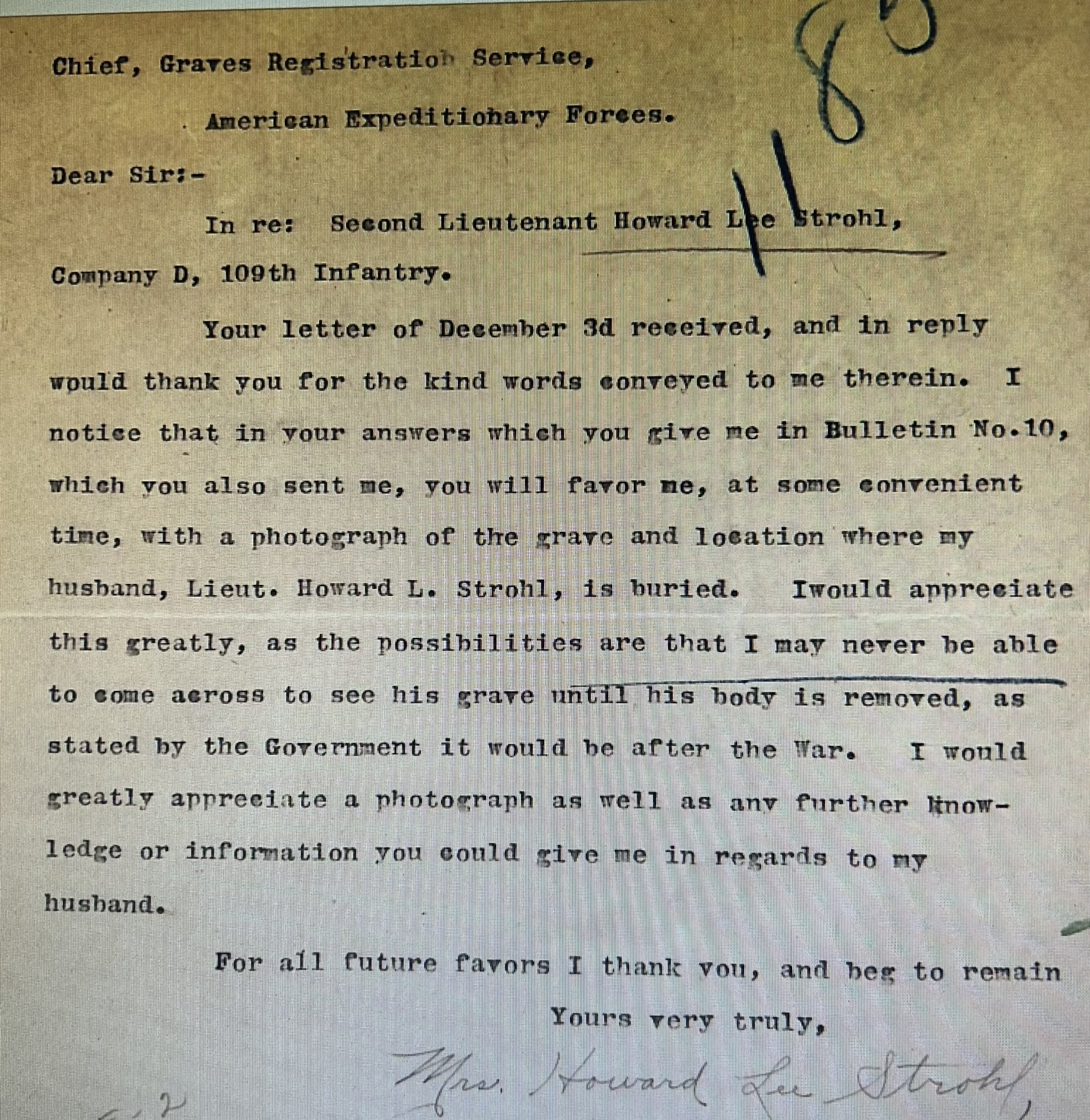 Having been informed that the Government intends to remove and send home the bodies of the American soldiers, and being deeply interested in this move on account of having lost my son, Lieut. Howard L. Strohl, 109th Machine Gun Bat. on last Aug. 9th, I will kindly ask you to forward me any information you may have concerning such action.