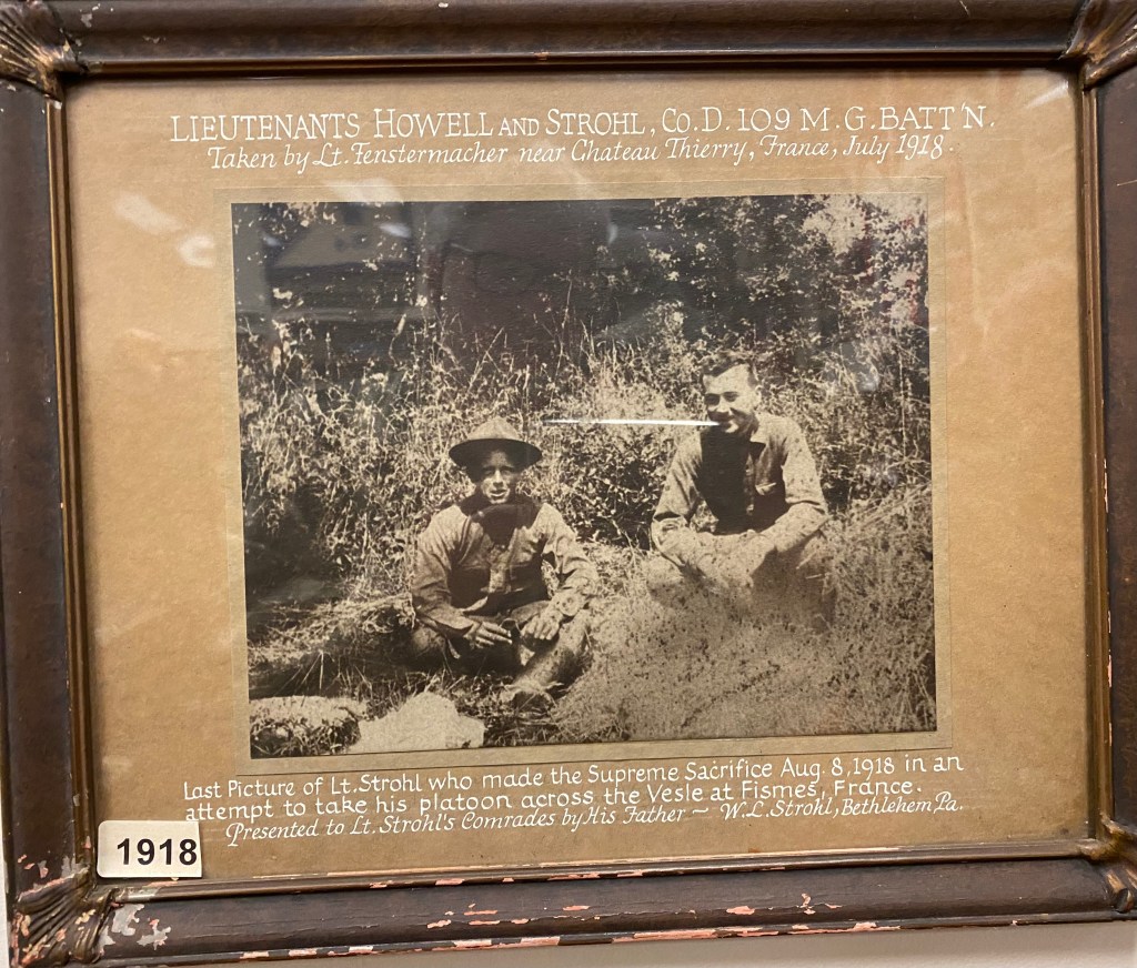 The museum at the National Guard armory in Allentown has a plaque with a photo showing two Army officers resting in a woods. They are Lawrence D. Howell and Howard L. Strohl, both lieutenants in Company D, 109th Machine Gun Battalion. A Lieutenant Fenstermacher caught them in a light moment, snapping the picture in July 1918 near Chateau-Thierry, France. The plaque reads: “Last picture of Lt. Strohl who made the Supreme Sacrifice Aug. 8, 1918 in an attempt to take his platoon across the Vesle at Fismes, France. Presented to Lt. Strohl’s Comrades by His Father – W.L. Strohl, Bethlehem, Pa.”