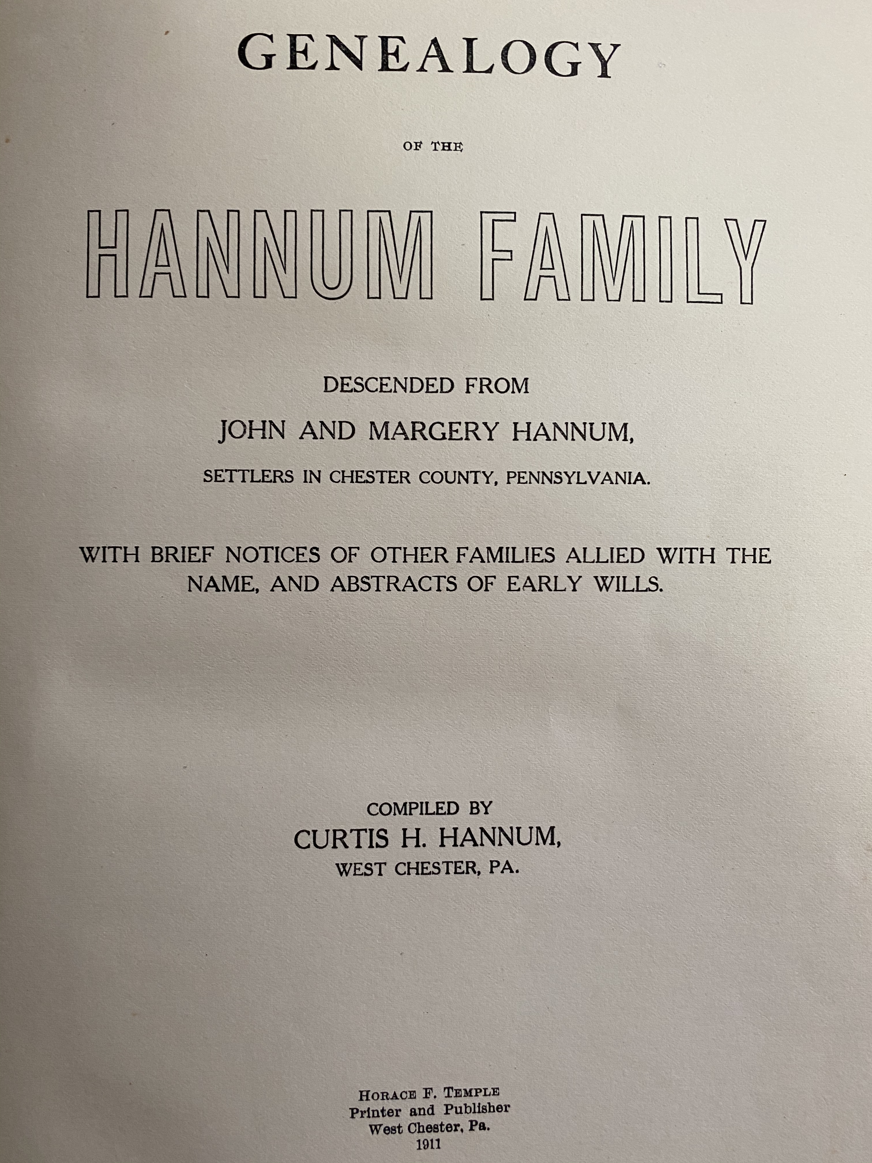 Now I needed to know how, or whether, we were related. I turned to Ancestry.com and a century-old Hannum family history my older brother lent me. The oversize book, A Record of the Descendants of John Hannum since 1686, takes up 696 pages. It was compiled by a Curtis H. Hannum, who worked on it for twenty-seven years before having it published in 1911.